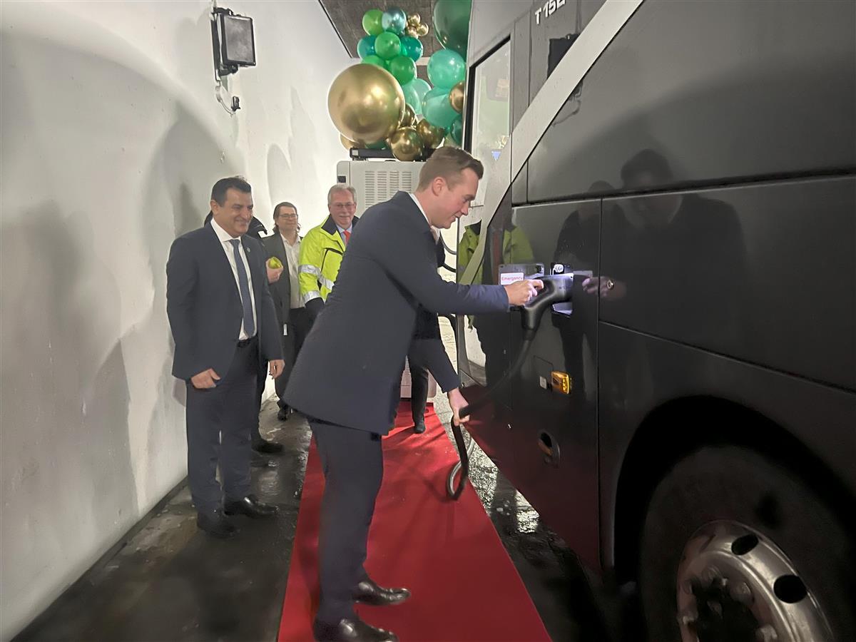 Håkon Snortheim, fylkesråd for samferdsel, åpnet Norges første lynlading av el-buss som er drevet av en kombinasjon av solceller og batteri. Denne milepælen for grønn mobilitet er installert på Oslo bussterminal.