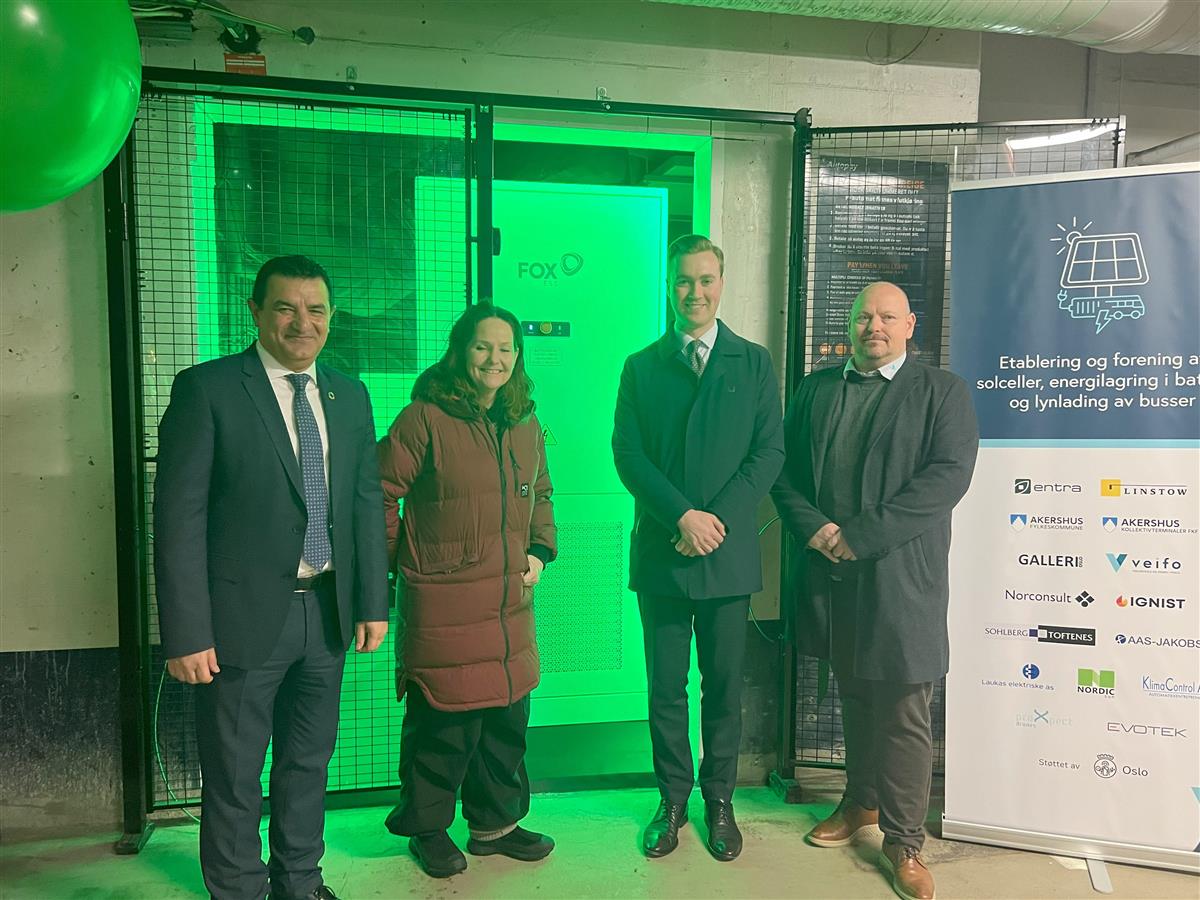 Besøk i kraftsenteret, der batteriene står. Fra venstre: Jafar Altememy, administrerende direktør i Vaterland Bussterminal AS, Heidi Sørensen, direktør for klimaetaten i Oslo kommune, Håkon Snortheim, fylkesråd for samferdsel i Akershus fylkeskommune og André Ibenholt, prosjektleder for solcelleprosjektet i Galleri Oslo. Jan Ivar Bøe, Akershus fylkeskommune