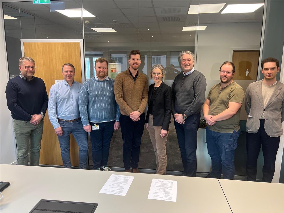 Fra venstre: prosjektsjef Håvard Kjendseth, prosjektleder Terje Rødne Hansen, anleggsleder Bengt Strømnes og adm.dir. Hans Kjetil Traen fra Marthinsen & Duvholt, avdelingsleder Birgitte Rodum, prosjektleder Bjørn Aage Innstrand, seksjonsleder Dan Paulsen og grunnerverer Ramen Dashty fra Akershus fylkeskommune.