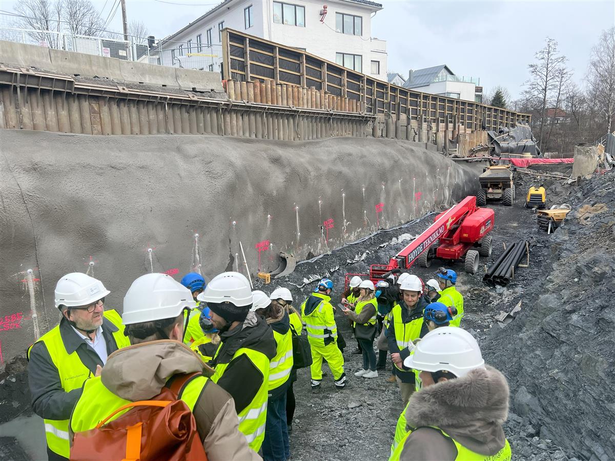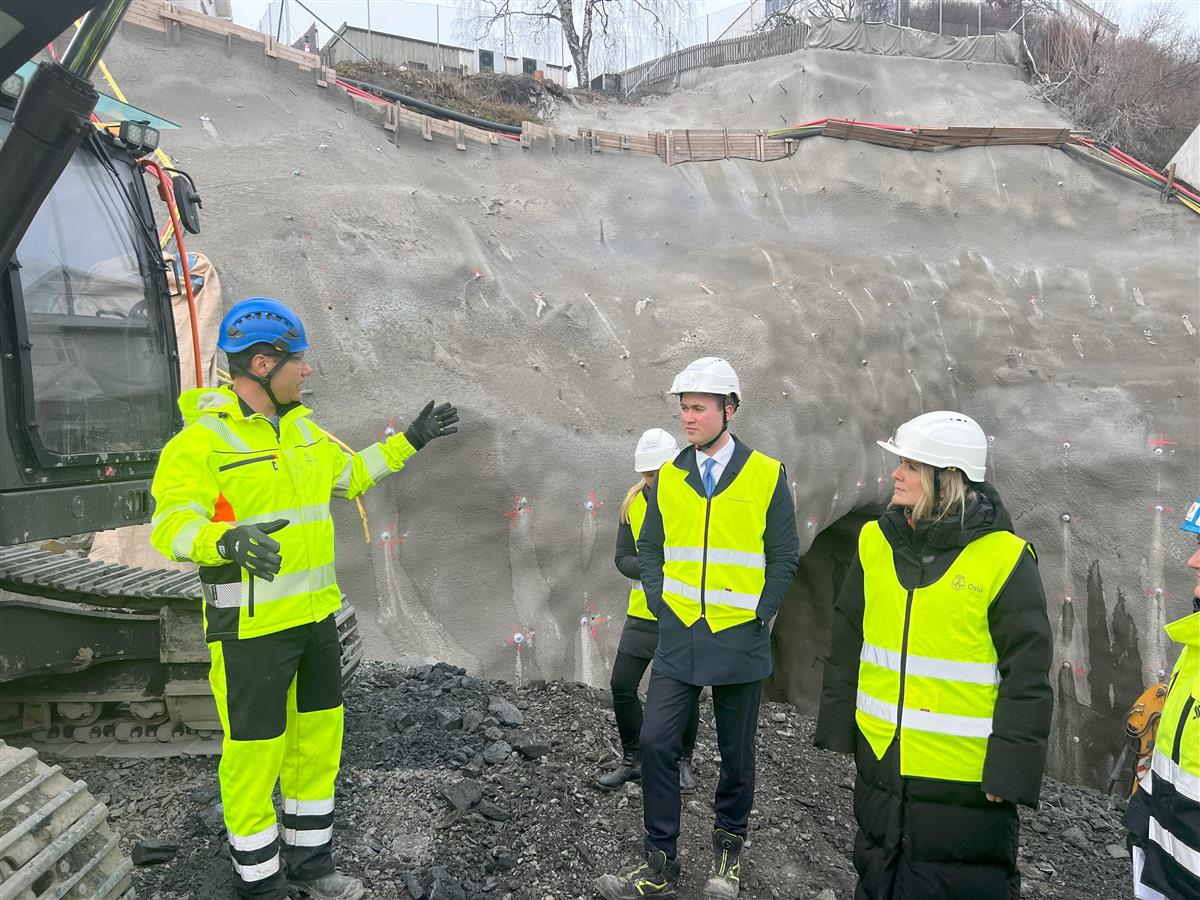 Håkon Snortheim, fylkesråd for samferdsel, og Marit Vea, byråd for miljø og samferdsel i Oslo kommune fikk se byggeplassen ved Majorstua. I bakgrunnen ses tunnelåpningen for Fornebubanens vestgående løp. Jan Ivar Bøe, Akershus fylkeskommune