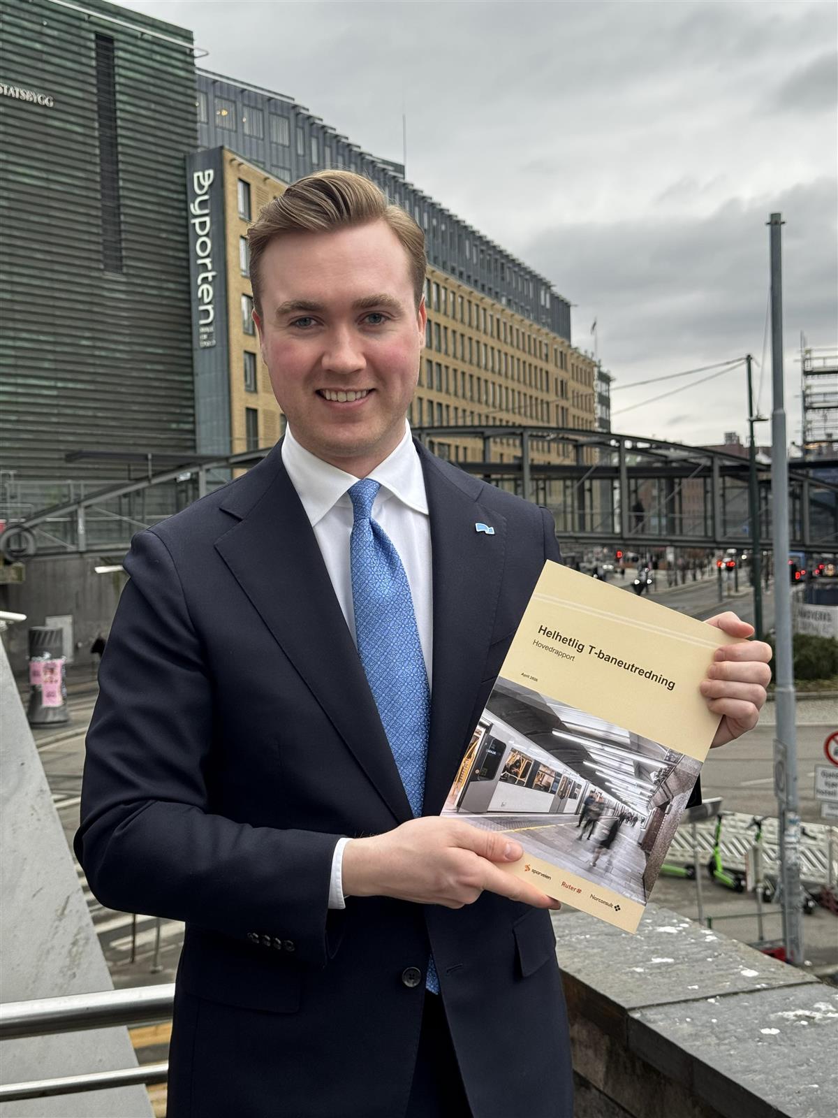 Håkon Snortheim (H), fylkesråd for samferdsel, fikk overlevert T-baneutredningen 15. april.