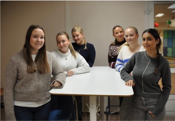 Fra venstre: Oda Opaker (2HEA), Ida Haugen (2HEA), Frida Andersson (2HEA), Vilde Gaarder (2BUA), Else Andersen (2BUA), Sandi Alfil (2BUA) skal reise fra Bjørkelangen til Giribe i vinter.