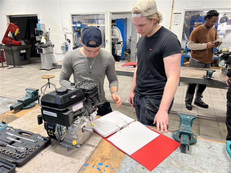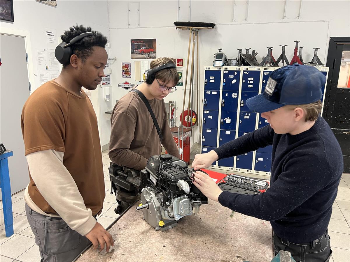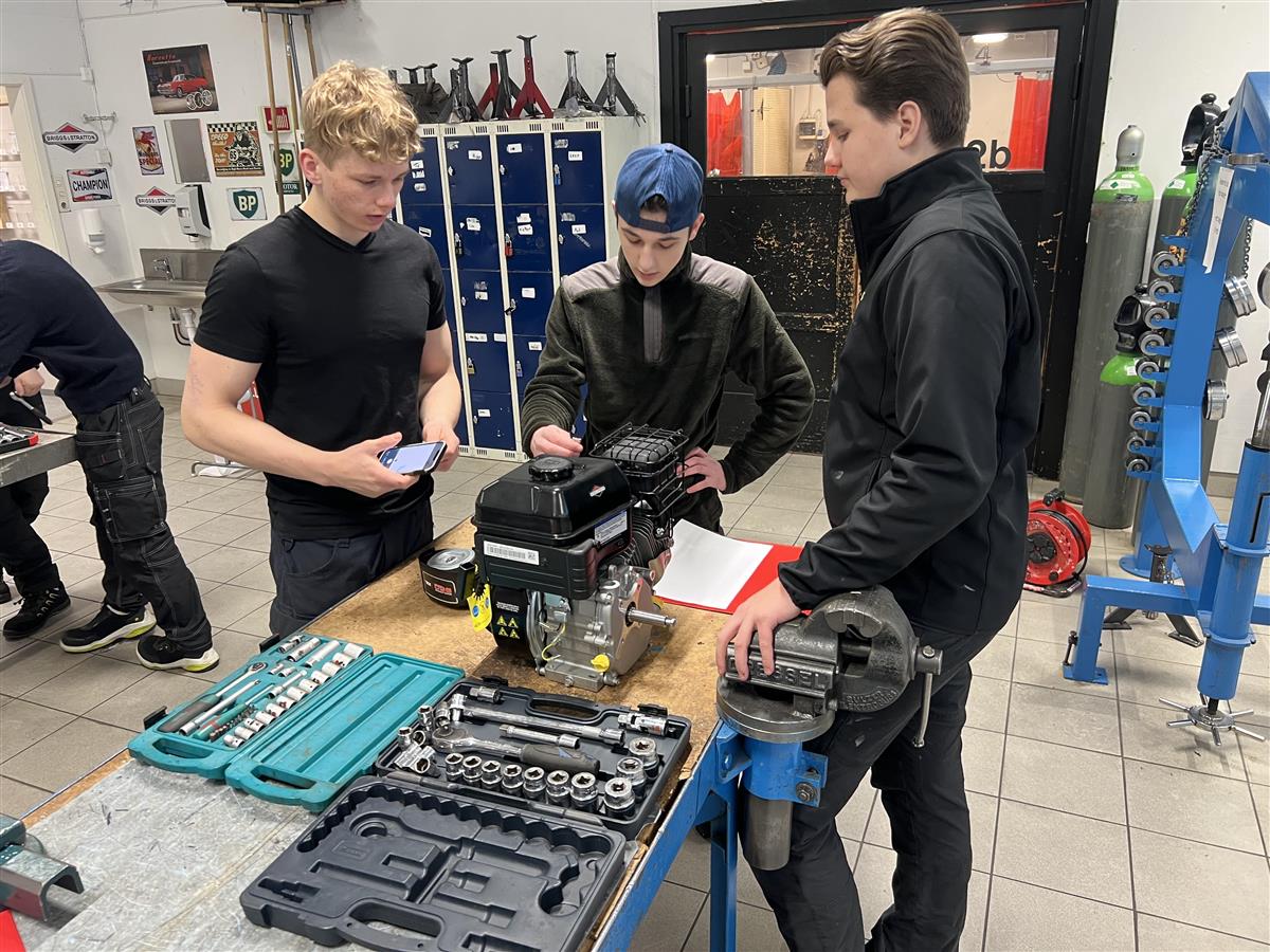 Her jobber de praktisk med demontering av en Briggs & Stratton-motor, der målet er å forstå hvordan en forbrenningsmotor er bygget opp og fungerer.