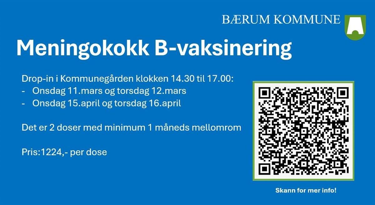 Meningokokk B-vaksineringBærum kommune starter med vaksinering av meningokokk B i mars.Drop-in i Kommunegården klokken 14:30 til 17:00Onsdag 11. mars og torsdag 12. marsOnsdag 15. april og torsdag 16. aprilDet er 2 doser med minimum 1 måneds mellomrom Pris: 1224,- pr. dose Publisert av Kathrine Hatlem Ingvaldsen Publisert 25.02.2026 15.18 Sist endret 25.02.2026 15.18