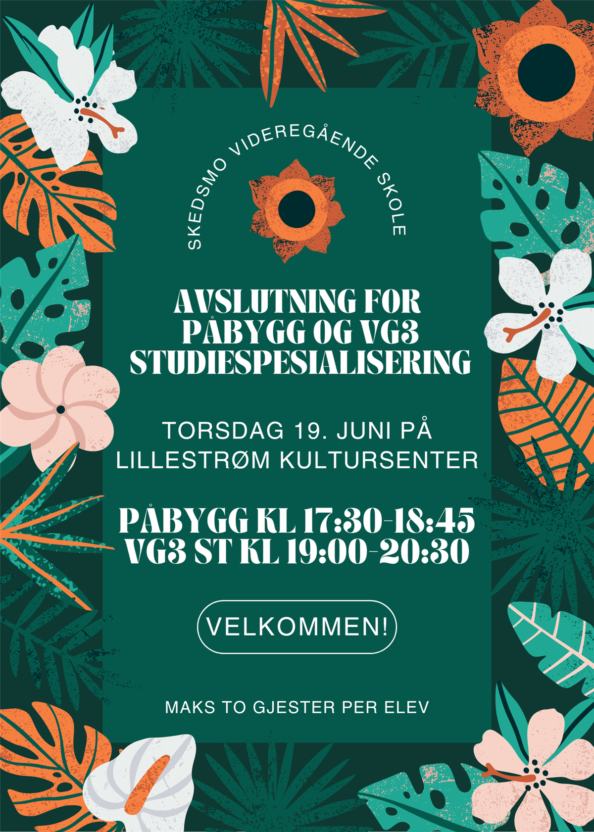 Avslutning for Vg3 studiespesialisering og påbyggVelkommen til avslutning på Lillestrøm kultursenter torsdag 19. juni!Invitasjon til avslutning Vg3 ST og påbygg Helena Huse Avslutning for påbygg og Vg3 studiespesialiseringTorsdag 19. juni på Lillestrøm kultursenterPåbygg kl 17:30-18:45Vg3 ST kl 19:00-20:30Velkommen!Maks to gjester per elev Publisert av Helena Marie Huse Publisert 12.05.2025 08.42 Sist endret 10.06.2025 09.53