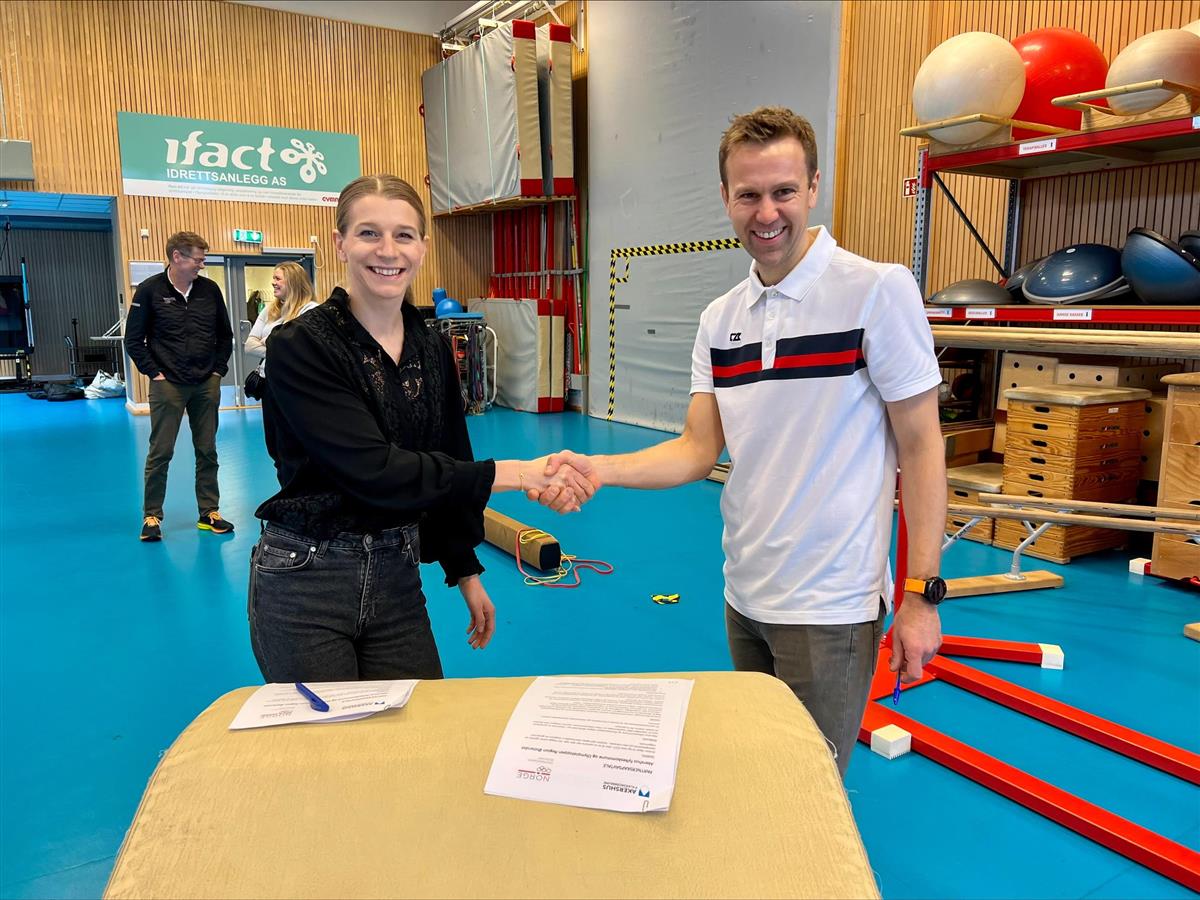 Tar hverandre i hendende etter signeringen: Fylkesråd Ida Lindtveit Røse og Eirik Hanssen fra Olympiatoppen Region Østlandet