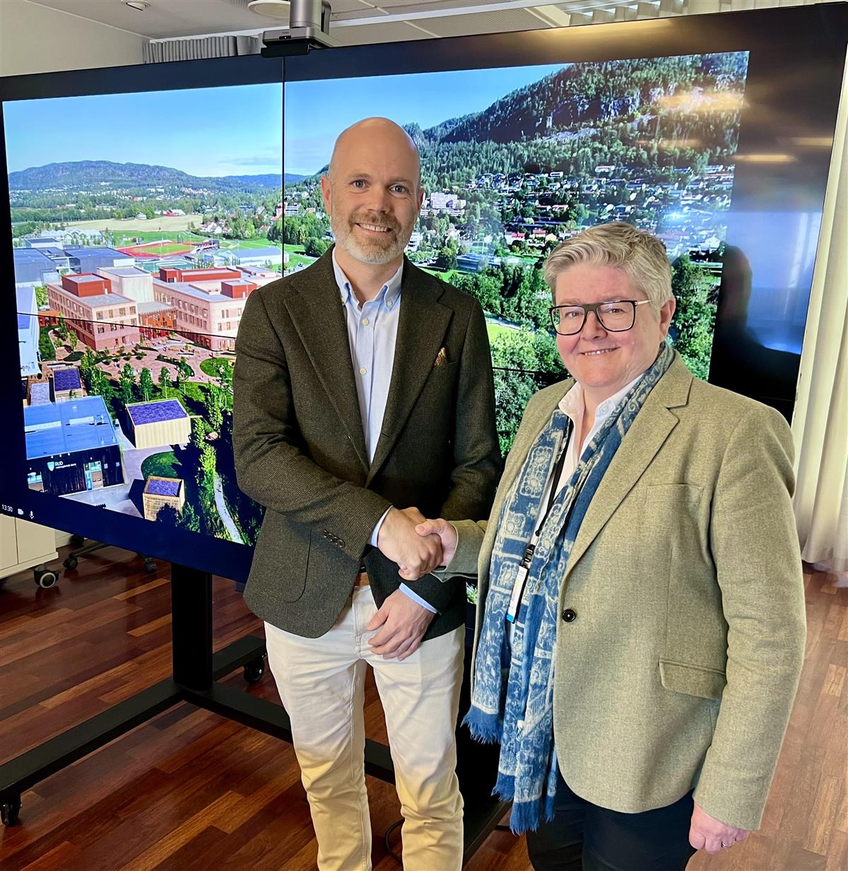 Tar hverandre i hånden: Anders Vestre og Anette Marie Solli (fremtidsbilde av Rud vgs på skjerm i bakgrunnen)