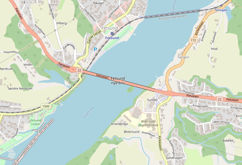 Kart over området: Her ser du Glommakrysningen på rv. 22 (Fetsundbrua i midten)