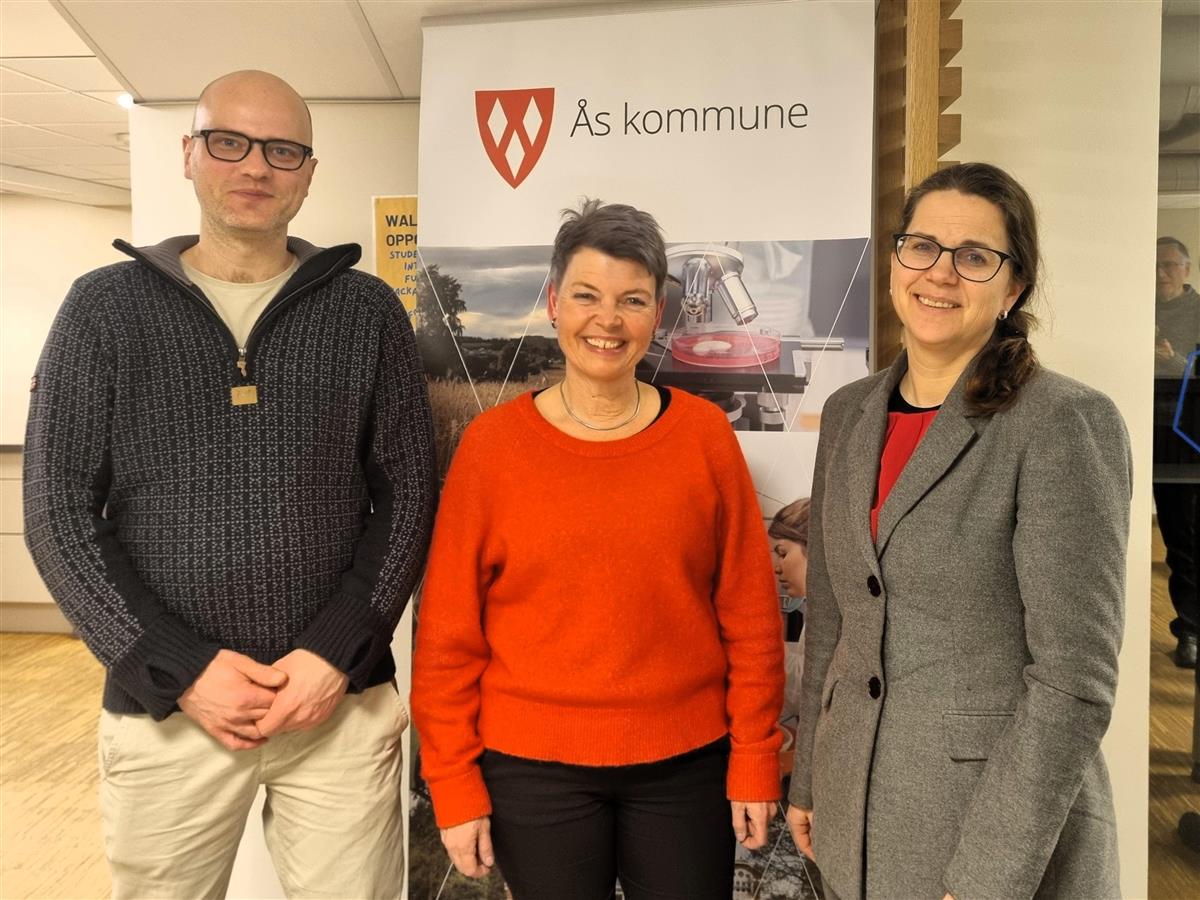 Fagkveld om naturrestaurering i Ås. Fra venstre: Ruben Roos, forsker i NINA, Elisabeth Dale, plan- og miljørådgiver i Ås kommune, og Solveig Schytz, fylkesråd for plan, kulturminner, klima og miljø i Akershus.