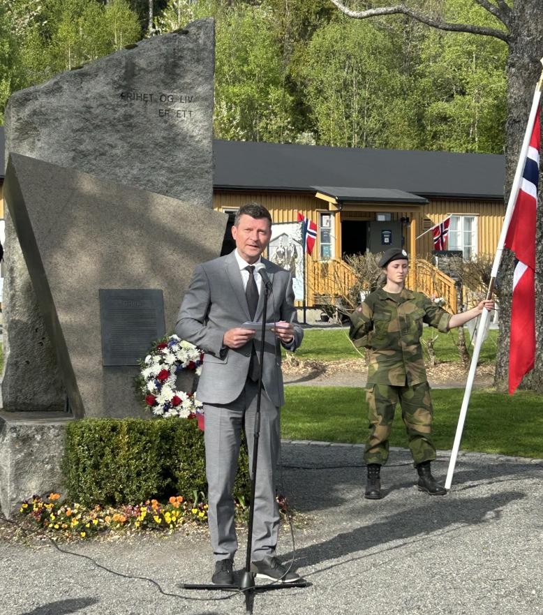 – I dag er det åtti år siden Nazi-Tyskland kapitulerte. Store deler av Europa lå i ruiner, og mange millioner mennesker var drept. Siden andre verdenskrig har vi sagt at det aldri må skje igjen. Derfor er det viktig å ære dem som har risikert livet for vår frihet, å minne oss selv på at fred og frihet ikke kan tas for gitt, og å gjøre det som er nødvendig for å unngå at noe som ligner andre verdenskrig kan skje igjen, sa fylkesordfører Thomas Sjøvold.