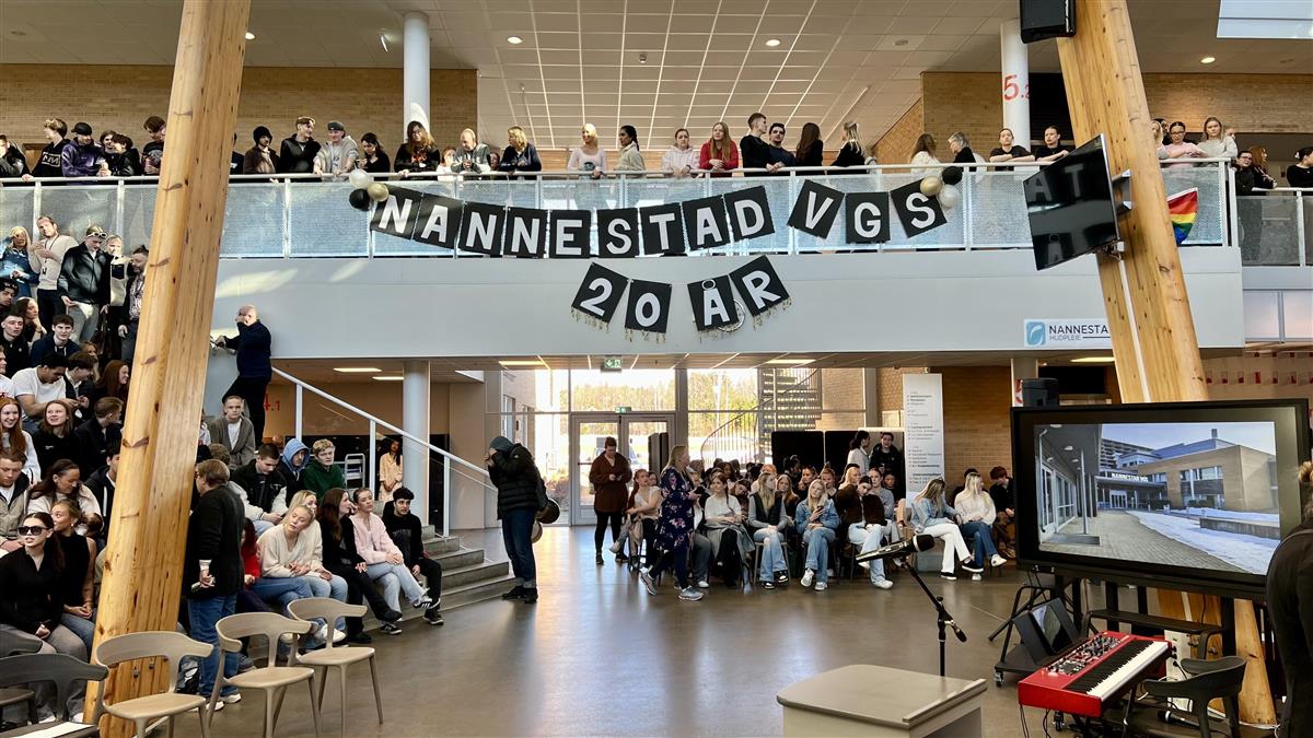 «Fugleberget» på Nannestad videregående skole var fylt til randen av elever og ansatte i forbindelse med markeringen av skolens 20-årsjubileum