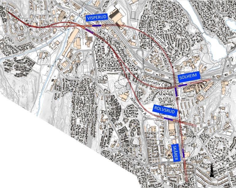 - Alternativ C, med to stasjoner: Visperud og nord på Skårersletta.