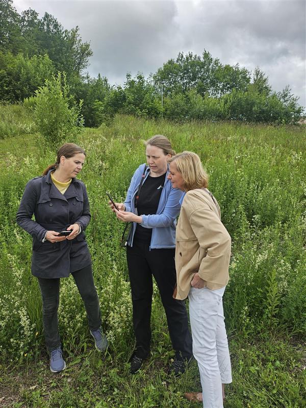 NINA-rådgiver Astrid Skrindo (i midten) demonstrerer bruk av appen Artsorakelet, som hjelper å identifisere rødlistede arter og arter med høyt skadepotensiale. Her på befaring ved Risenga i Asker, sammen med fylkesråd Solveig Schytz (V), og varaordfører i Asker, Monica Vee Bratlie (H). Risenga er vurdert som et av områdene i Asker som kan løftes frem for restaurering.