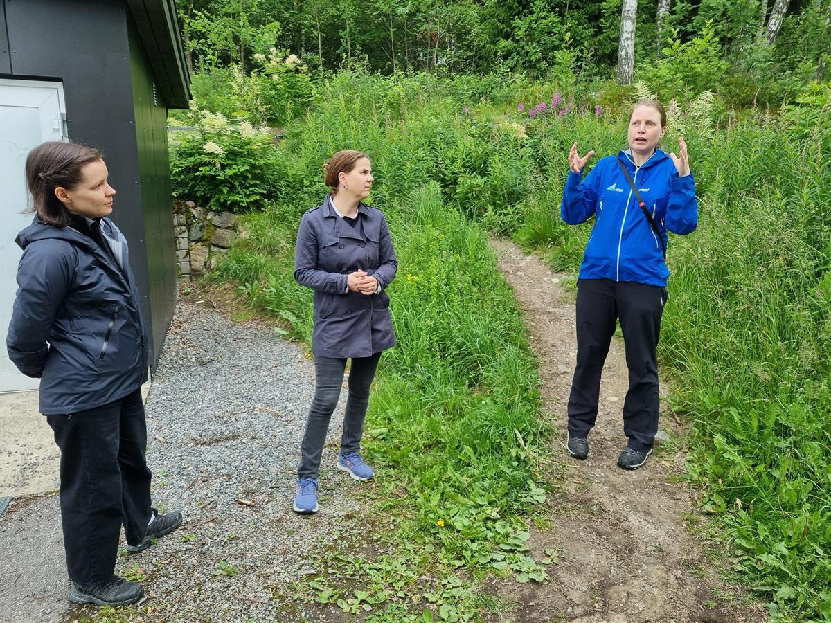 Forsker Astrid Skrindo fra NINA (t.h.) forteller engasjert om naturkartleggingen de gjør i samarbeid med Lørenskog kommune og Akershus fylkeskommune. Her sammen med naturforvalter Marlene Stubberud i Lørenskog kommune og fylkesråd Solveig Schytz, ved Langvannet i Lørenskog.