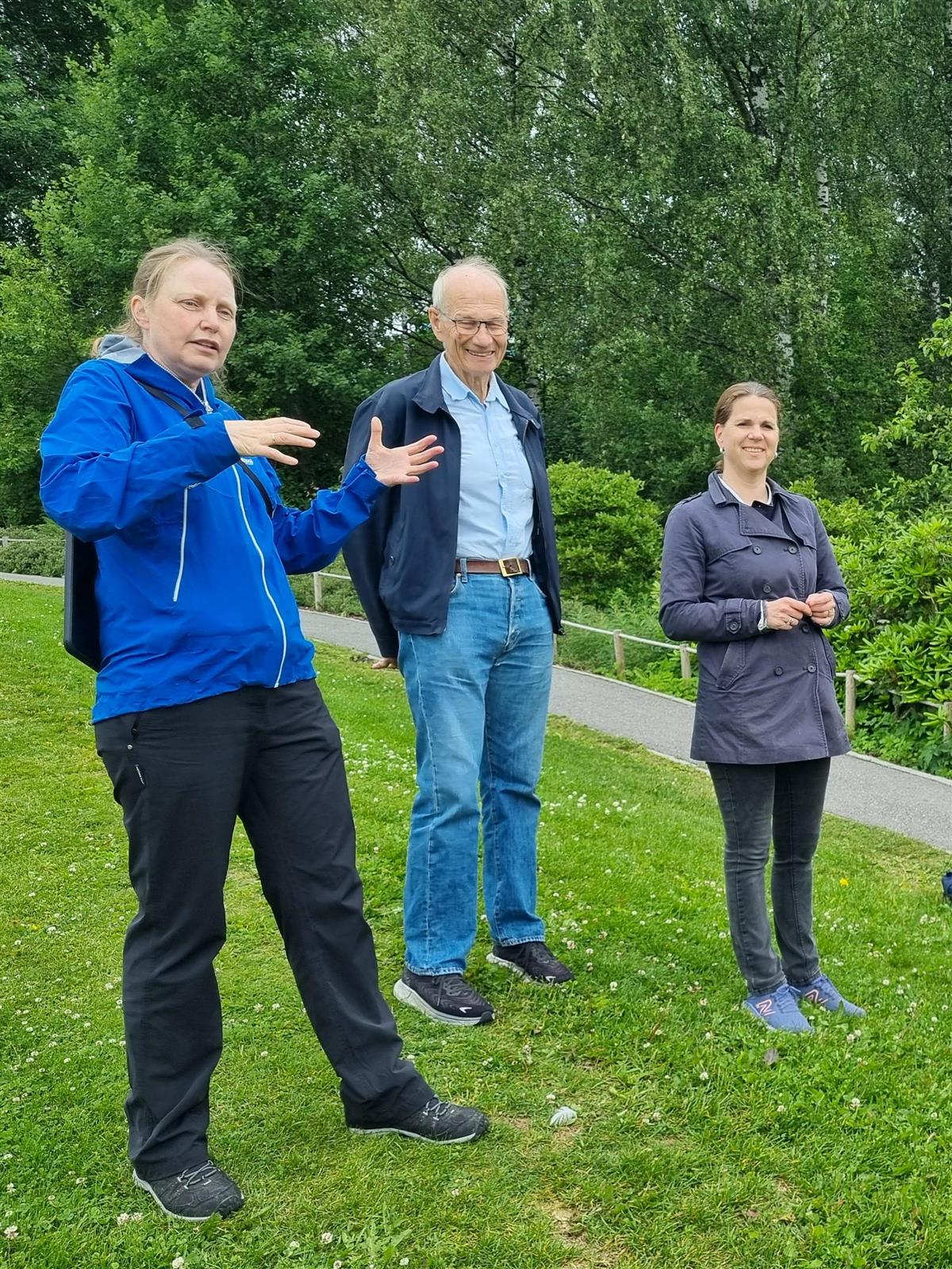 Befaring i Rådhusparken i Lørenskog kommune. F.v.: Astrid Skrindo, forsker i NINA, Knut Berg (H), utvalgsleder Lørenskog kommune, og Solveig Schytz (V), fylkesråd i Akershus fylkeskommune.