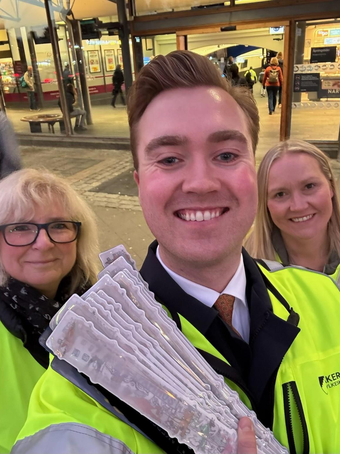 Delte ut reflekser på Lillestrøm stasjon: (fv.) Lise Hagen Rebbestad (H), fylkesråd for opplæring og kompetanse, Håkon Snortheim (H), fylkesråd for samferdsel og Kine Berg Osan fra avdeling for samferdsel, trafikksikkerhet og miljø.