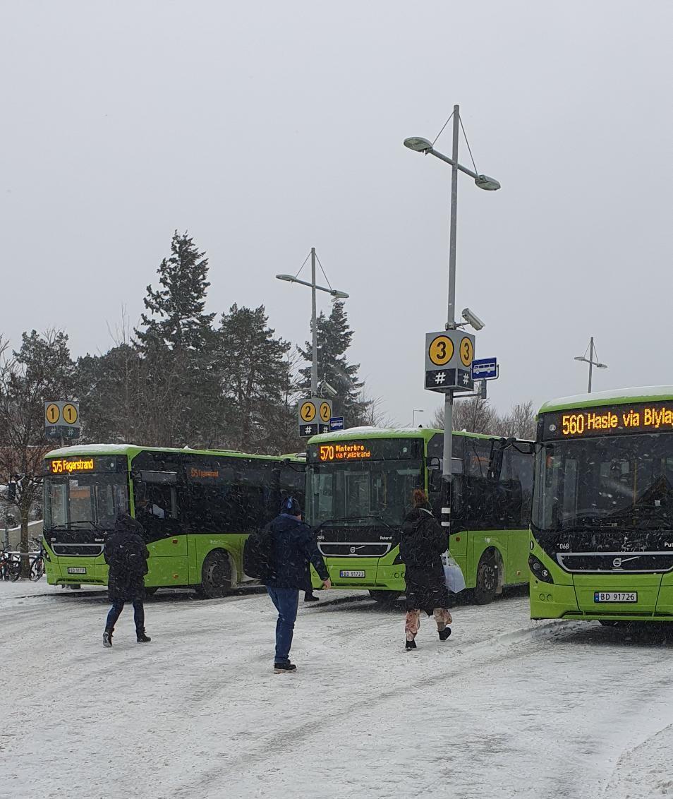 Slipp brøytemannskapet fram Mye snø skaper utfordringer på fylkesveiene. Beregn god tid, slipp fram brøytemannskap og følg med på Ruters informasjon om kollektivtrafikken.– Dersom det blir hendelser og stopp i trafikken, blir brøytebilene også stående fast i trafikken. Brøyting av de viktigste veiene blir prioritert først, sier fylkesdirektør for samferdsel, Thomas Tvedt.Les mer om brøyting, strøing og salting av fylkesveier. Forsinkelser i kollektivtrafikken Tangen terminal, Nesodden Marius Fält-Vannum, Akershus fylkeskommune Ruter melder at det er forsinkelser og innstilte avganger på grunn av snø og vanskelige kjøreforhold. Sjekk hva som gjelder for din reise på Ruters reiseplanlegger (ruter.no) Mer informasjonSlik vedlikeholder vi fylkesveiene i vinterTrafikkmeldinger, webkamera og ruteplanlegger (vegvesen.no) Reiseråd på vinterføre (ruter.no) Publisert av Jan Ivar Bøe Publisert 07.01.2025 09.50 Sist endret 18.11.2025 15.01