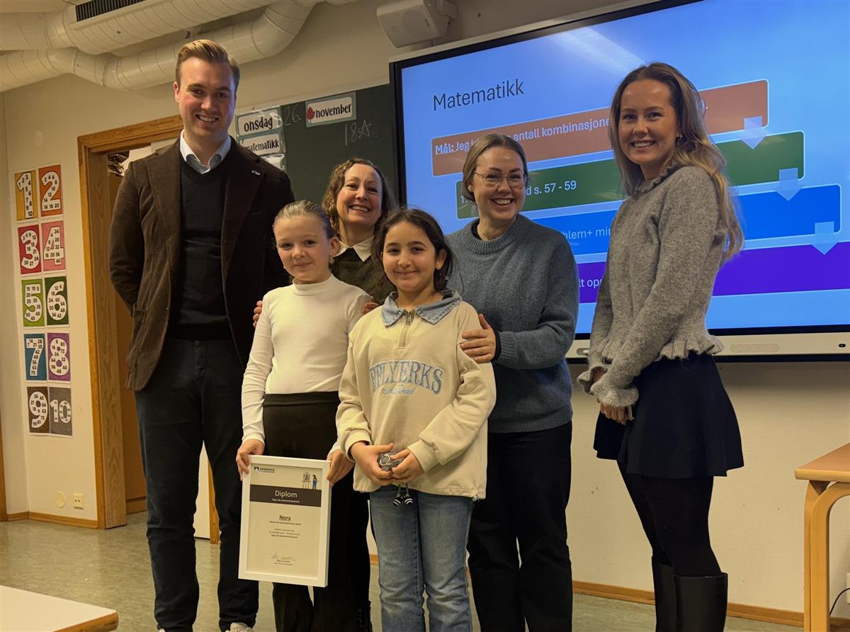 Håkon Snortheim (H), fylkesråd for samferdsel, besøkte Garderåsen skole for å overrekke diplom til Nora og premien, som er en kinotur til Lillestrøm for 4. klassen Nora går i.