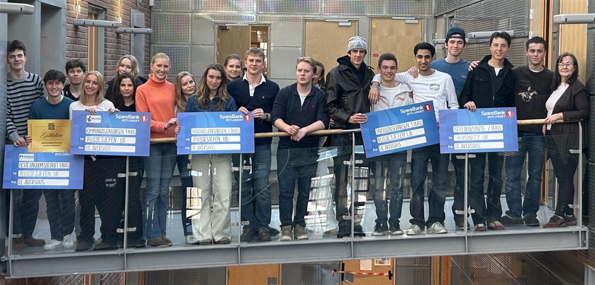 Ungdomsbedrift-klassen samlet seg på broen inne på Asker vgs for et gruppebilde med prisene sine.