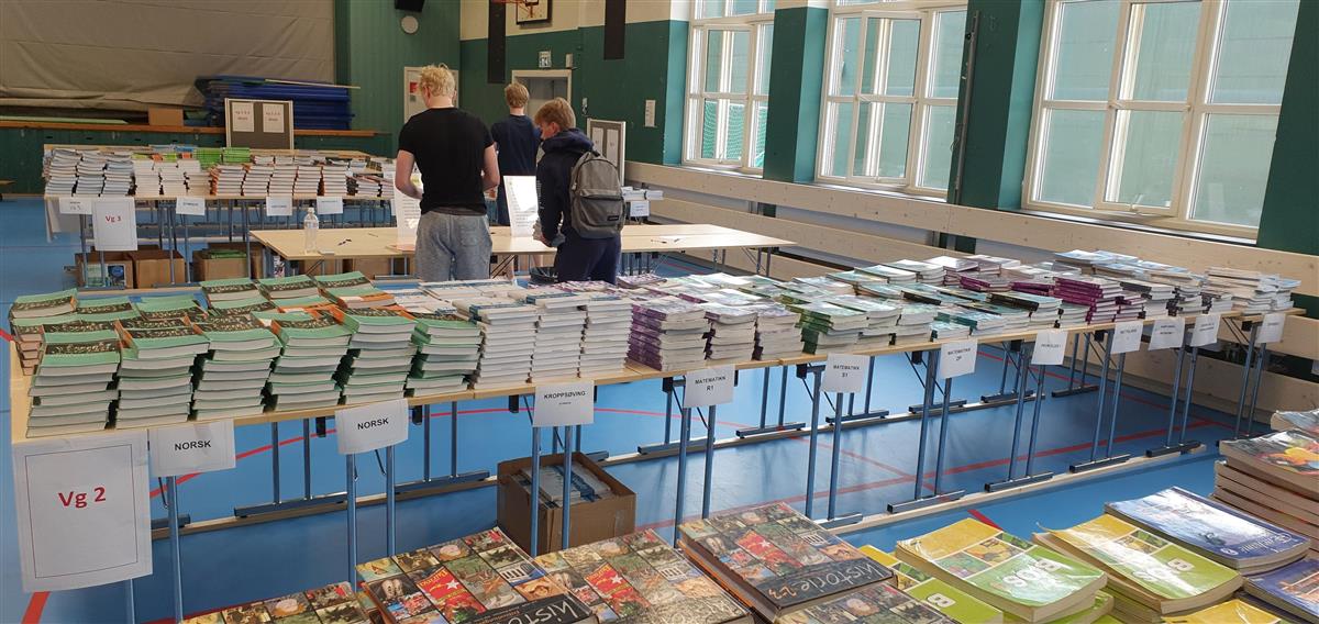 Elevene får utdelt lærebøker og kalkulator klassevis i gymsalen rett etter skolestart. Disse leveres inn igjen samlet før sommeren slik at tilstand og antall kan kontrolleres.