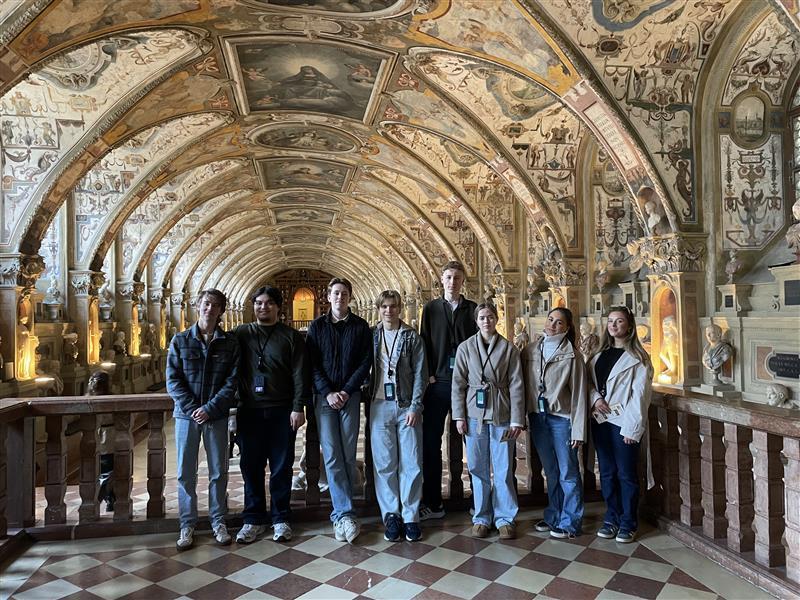 De åtte elevene hadde en innholdsrik og lærerik tur til München, her er de inne i slottet "Residenz".