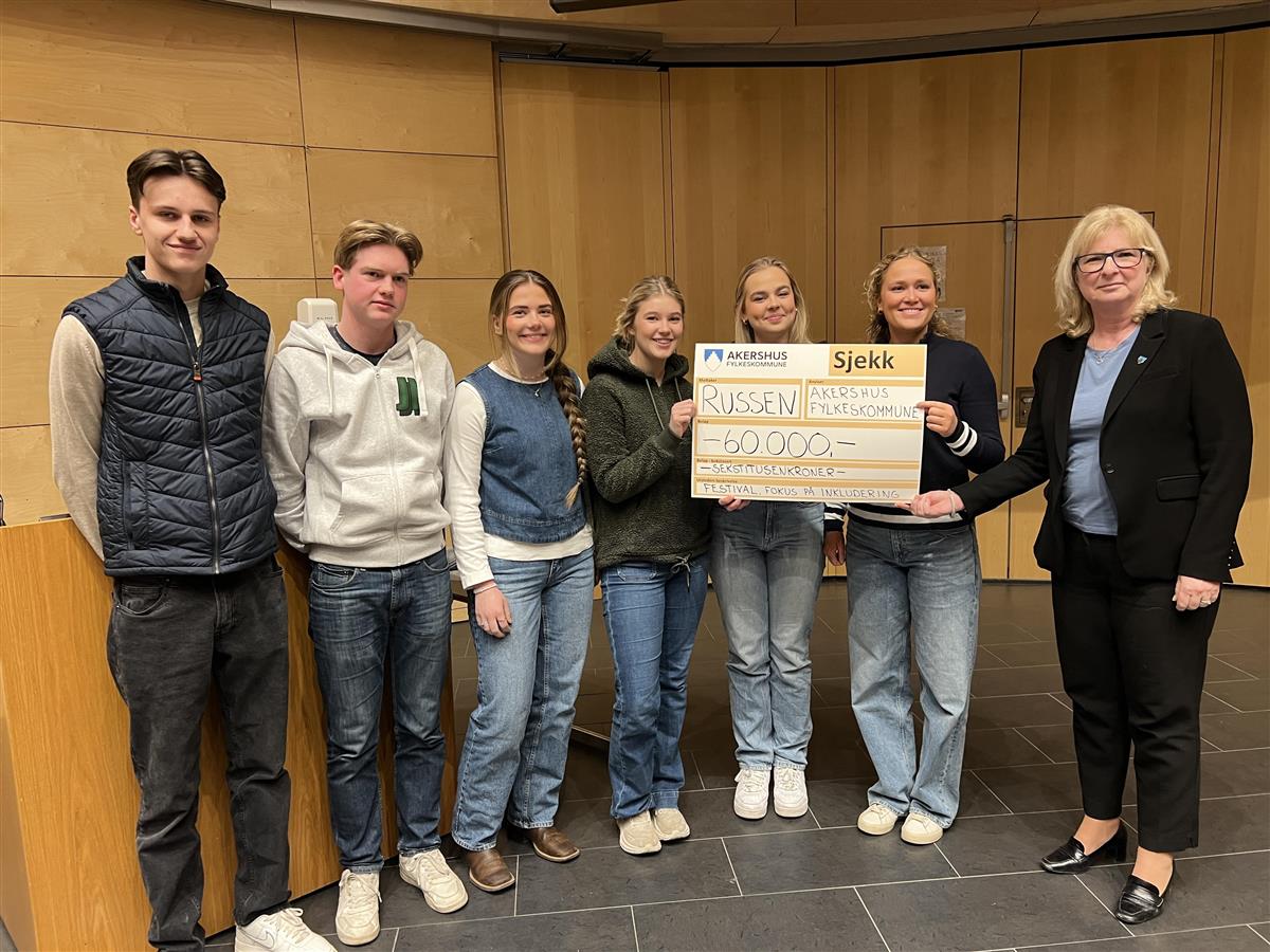 F.v.: Kristoffer Slorbak Thuen, Emil Alexander Ødegaard Lund, Martine Nordli Lundeberg, Nora Lang Lillehol, Dina Holmedahl og Elise Husvik Berhus mottok sjekken fra fylkesråd Lene Hagen Rebbestad (t.h).