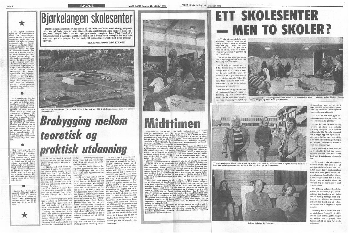 Oppslag i Vårt Land etter at Bjørkelangen skolesenter åpnet 15. oktober 1971.
