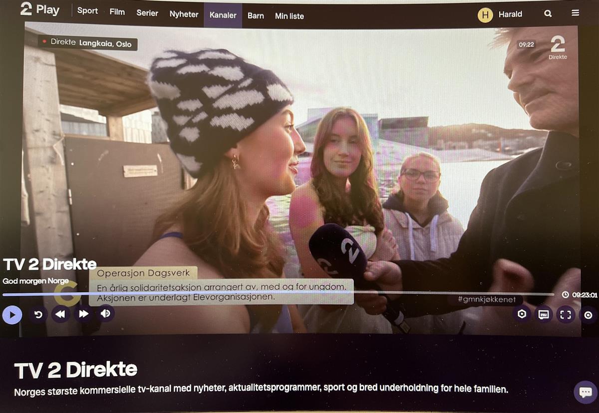 Torsdag 31. oktober var det mange elever ute og jobbet til inntekt for Operasjon Dagsverk for å samle inn penger til unge bønder i Guatemala. Cara, Amalie og Maren fra 3MKA jobbet et dagsverk for Oslo Badstuforening og ble intervjuet på direkten av God Morgen Norge på TV2.