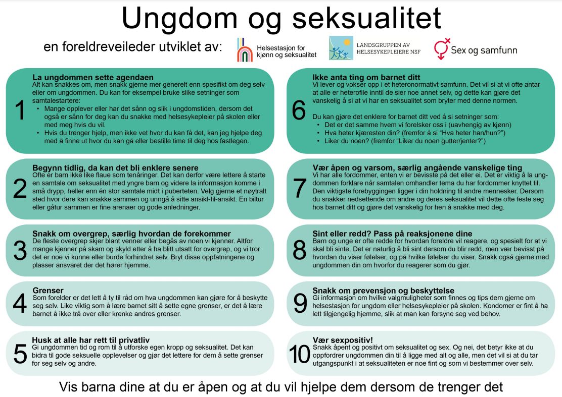 For å støtte en trygg seksualitetsutvikling vil noen skoler tilby et foreldremøte, med tips til hvordan snakke med ungdom om seksualitet. Hvis dette ikke arrangeres på deres skole, anbefaler vi at dere leser denne foreldreveilederen. Ønsker du mer informasjon om hvordan du kan starte praten med barnet ditt finnes dette for barn og ungdom på Bufdir sine hjemmesider.