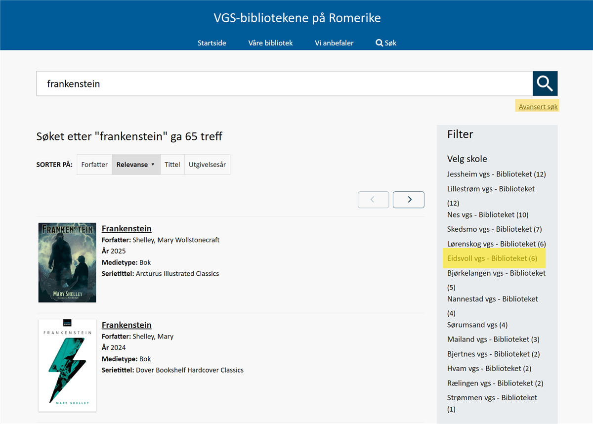Søk i bibliotekbasenBasen er samkjørt med andre videregående skoler i Romerike. Skriv inn søket ditt og velg Eidsvoll vgs - Biblioteket under “Filter” til høyre på siden, for å se hva vi har her på skolen vår. Du kan også gå inn på “Avansert søk” og fylle inn søkekriteriene dine her. Søk i bibliotekbasen Publisert 01.06.2020 09.50 Sist endret 12.11.2025 10.37