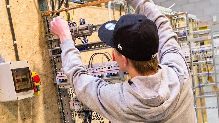 Bildet viser elev som monterer en sikringstavle. - Klikk for stort bildeElektroavdelingen har moderne utstyr, og elevene kan utføre praktiske oppgaver på verkstedet. JS Norge/Eidsvoll vgs