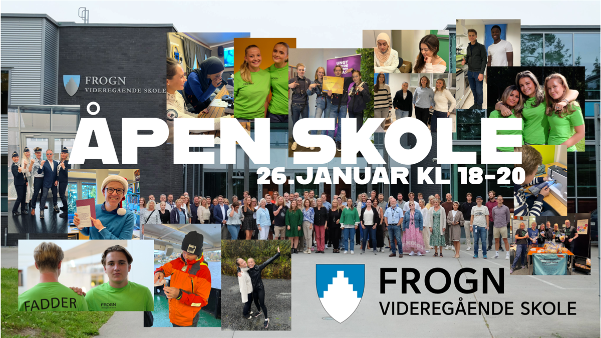 Åpen skole 2026Kom og opplev hvordan det er å være elev hos oss!Vi inviterer til en innholdsrik kveld. Kom når det passer deg i tidsrommet kl. 18.00 – 20.00, og få en guidet tur der du får treffe mange av våre elever og lærere i aktivitet. Niclas Stensrud Andersen Følg oss gjerne på ulike sosiale medier for en nedtelling mot dagen:Frogn videregående på FacebookFrogn videregående på InstagramFrogn videregående på TikTokVelkommen! Publisert av Erik Svendsen Publisert 22.12.2025 09.47 Sist endret 22.12.2025 09.47