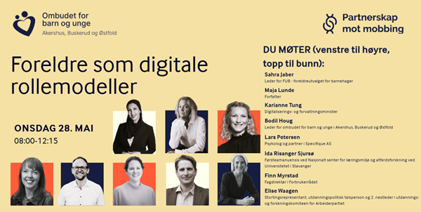 09:00-09:30 Panelsamtale om foreldre som digitale rollemodeller. Deltakere: Maja Lunde (forfatter), Lars Pedersen (Specifique), Sahra Jaber (FUB), Elise Waagen (utdannings- og forskningskomiteen), Finn Myrstad (Forbrukerrådet) og Ida Risanger Sjursø (Universitet i Stavanger).