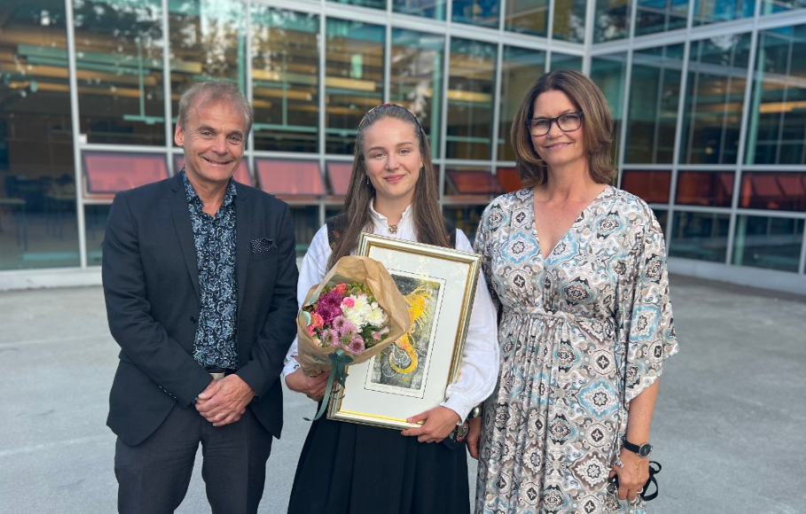 Signe Slyngstad Bergan mottok en gjev pris. Her sammen med kontaktlærer Gunnar Solvang og rektor ved Frogn videregående skole, Brit Marie Helle.