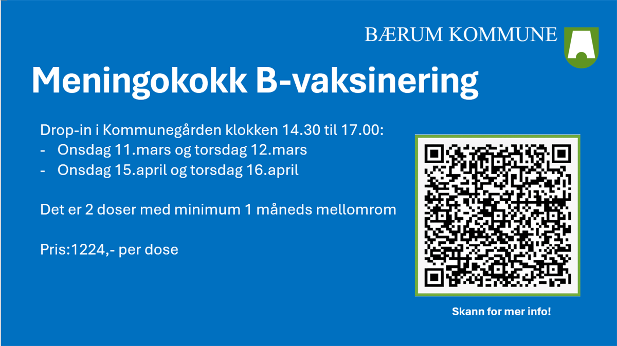 Tilbud om Meningokokk B vaksineringBærum kommune tilbyr vaksinering mot Meningokokk B. Publisert av Thomas Leirset Publisert 03.03.2026 14.21 Sist endret 03.03.2026 14.21