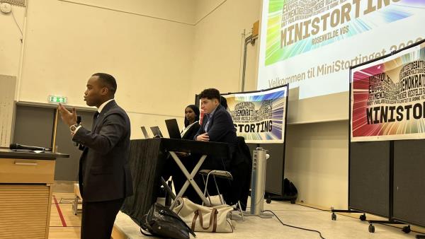 Stortingsrepresentant Hashim Abdi (21 år, AP) åpnet MiniStortinget . "Vi unge har nye løsninger som samfunnet trenger. Engasjement og diskusjoner...