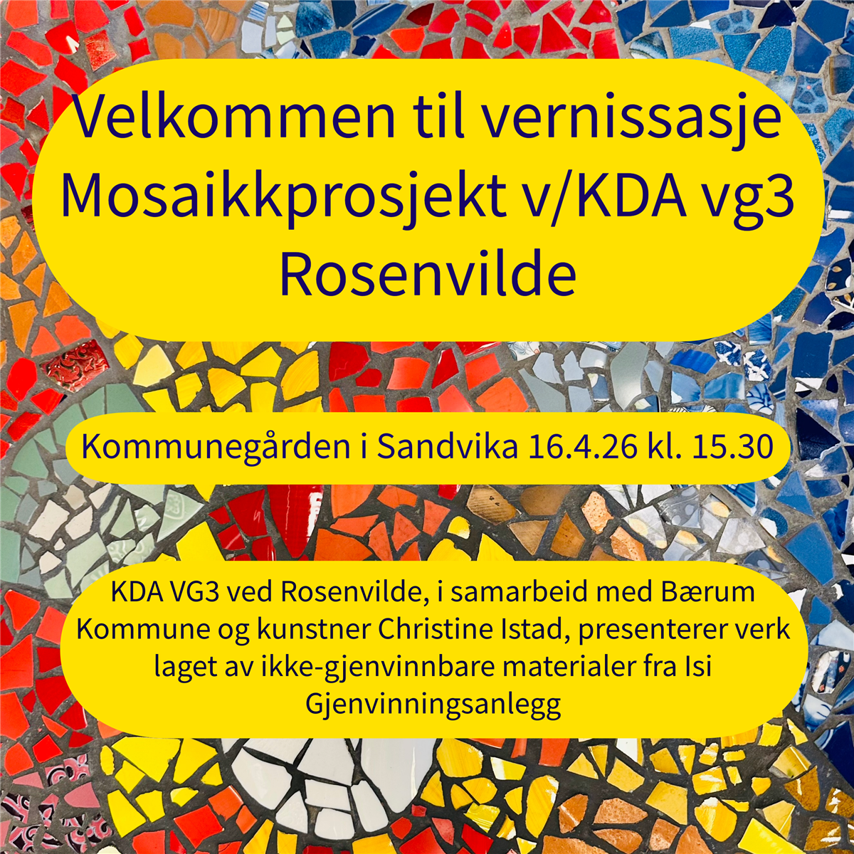 Elevene på VG3 ved KDA Rosenvilde har, i samarbeid med kunstneren Christine Istad og Bærum kommune, laget en kunstutstilling med mosaikker av resirkulerte materialer fra Isi miljøstasjon.