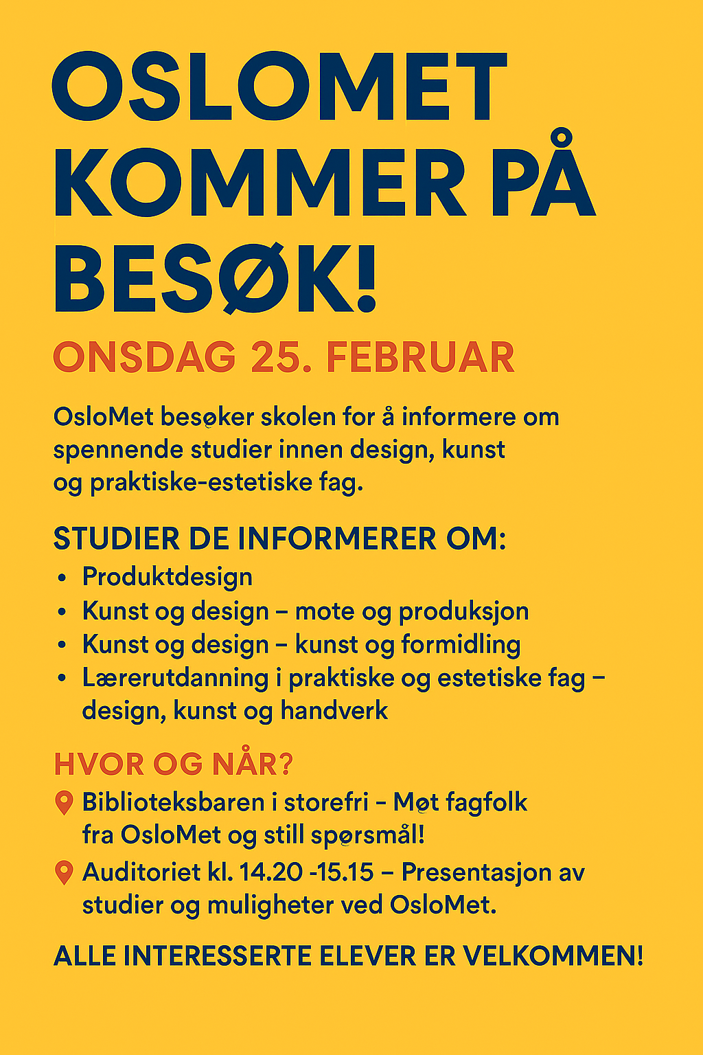 OsloMet kommer på besøk 25.2.2026OsloMet besøker Rosenvilde for å informere om spennende studier.OlsoMet kommer på besøk OsloMet Publisert av Anna Kvinnsland Publisert 24.02.2026 13.11 Sist endret 02.03.2026 09.06
