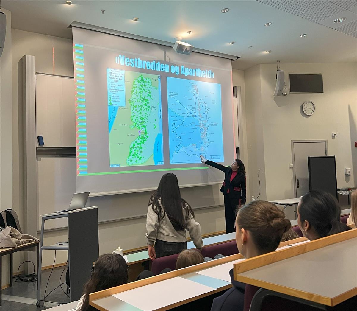 Elevene i samfunnskunnskap fikk besøk av Palestinakomiteen i Asker og Bærum ved leder Gia Deyab og styremedlem Knut Erik Steen. For et fullsatt auditorium snakket Deyab om de palestinske flyktningenes historie og hvordan det er å leve på Vestbredden. Elevene lærer om medborgerskap og fikk innblikk hvor ulike livssituasjoner palestinere og israelere har på den okkuperte Vestbredden.