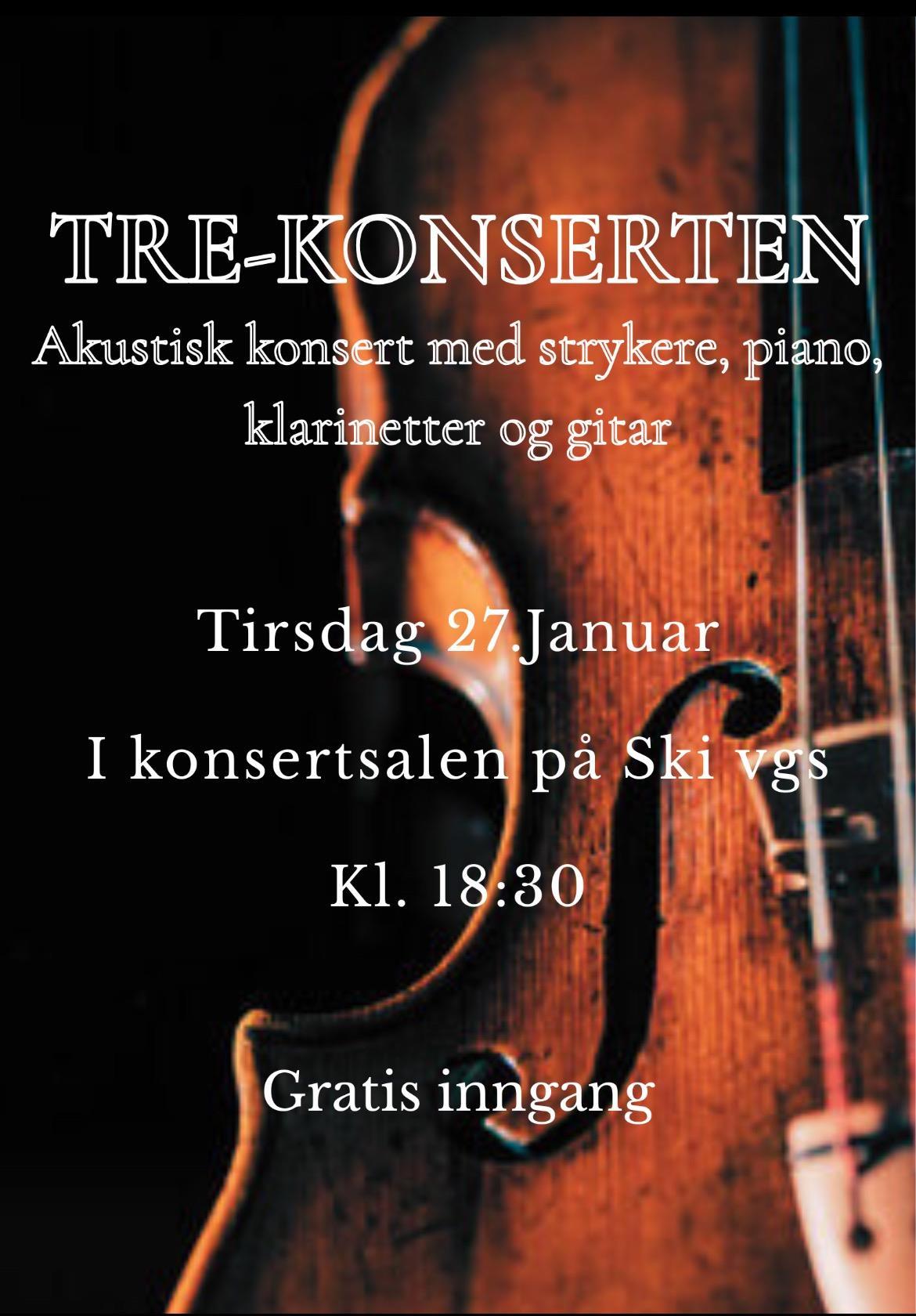 Tre-konsert tirsdag 27. januarVelkommen til akustisk konsert med våre elever på musikklinjenPlakat for tre-konserten Ski videregående skole Publisert av Catherine Elizabeth Rugaard Alvarez Publisert 23.01.2026 13.02 Sist endret 23.01.2026 13.02
