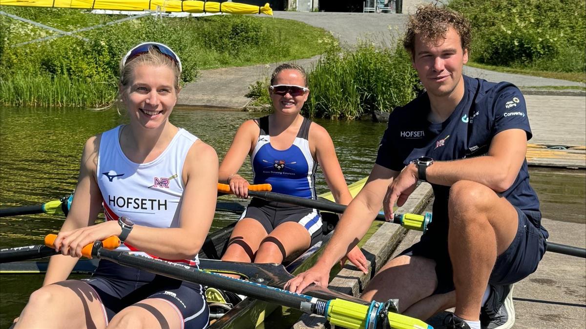 Fylkesråd Ida Lindtveit Røse fra et tidligere besøk på Årungen. Her i kajakk sammen med juniorroer Ane Høien og Oskar Sødal.