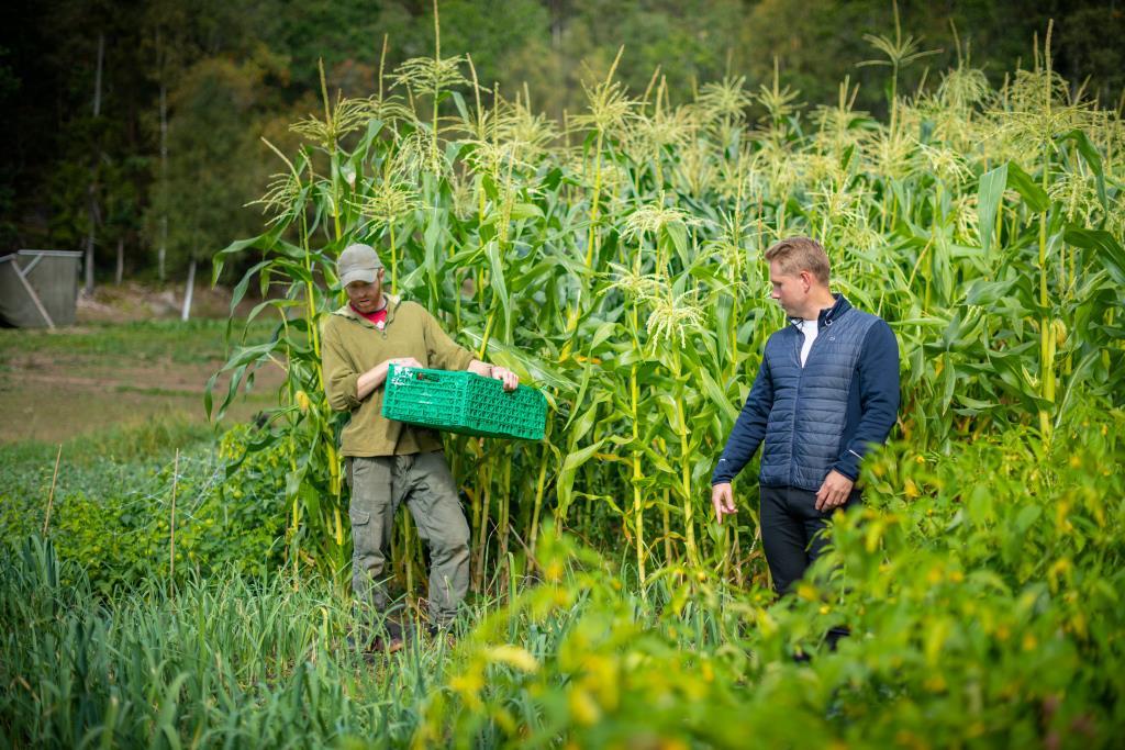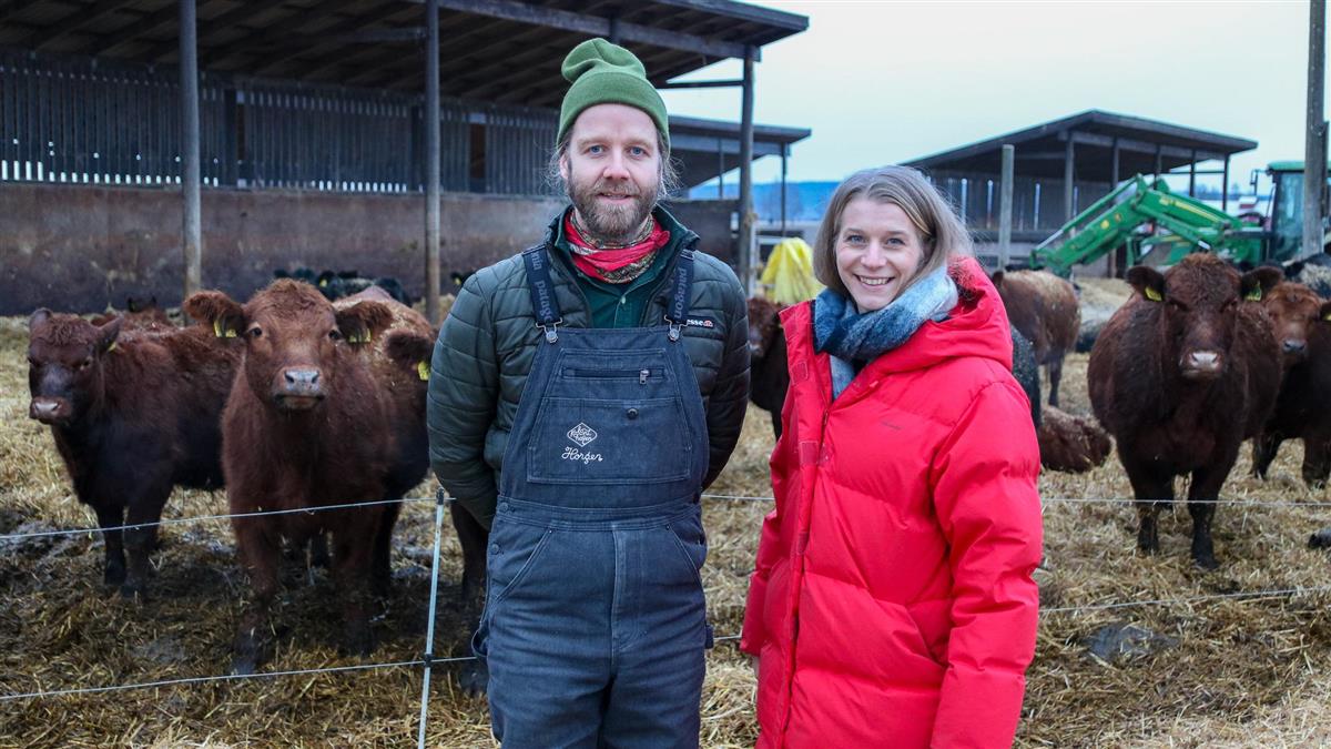 Fylkesråd for næring, Ida Lidtveit Røse, mener landbruksnæringen er viktig for Akershus. Her på besøk på Horgen gård i Nes, sammen med eier og gårdbruker Gudbrand Quale