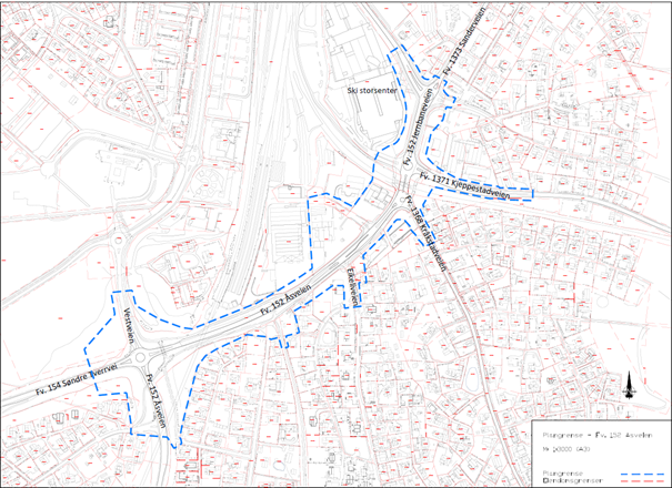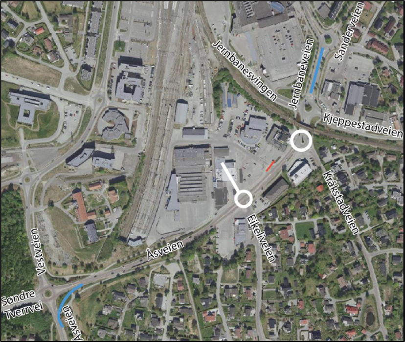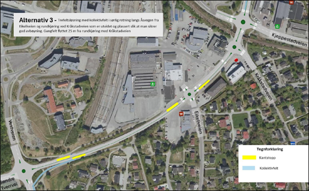 Figur 3: Fellesgrepene for alle alternativene var: et filterfelt fra rundkjøringen med Søndre Tverrvei Fra Åsveien sør inn mot Ski sentrum; rundkjøring med Eikeliveien som skal erstatte dagens T-kryss til Eikeliveien og Åsveien 3-15; en utvidet og forskjøvet (mot vest) rundkjøring ved Kråkstadveien; venstrestilt kollektivfelt langs Jernbaneveien, som i dag er høyerestilt.