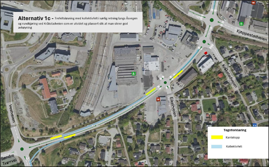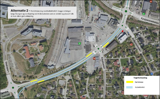 Figur 5: I tillegg til fellesgrepene omfatter Alternativ 2 et ekstra kollektivfelt i hver retning (4 felt) langs Åsveien mellom Kråkstadveien og Søndre Tverrvei. Begge kollektivfeltene er høyrestilt.