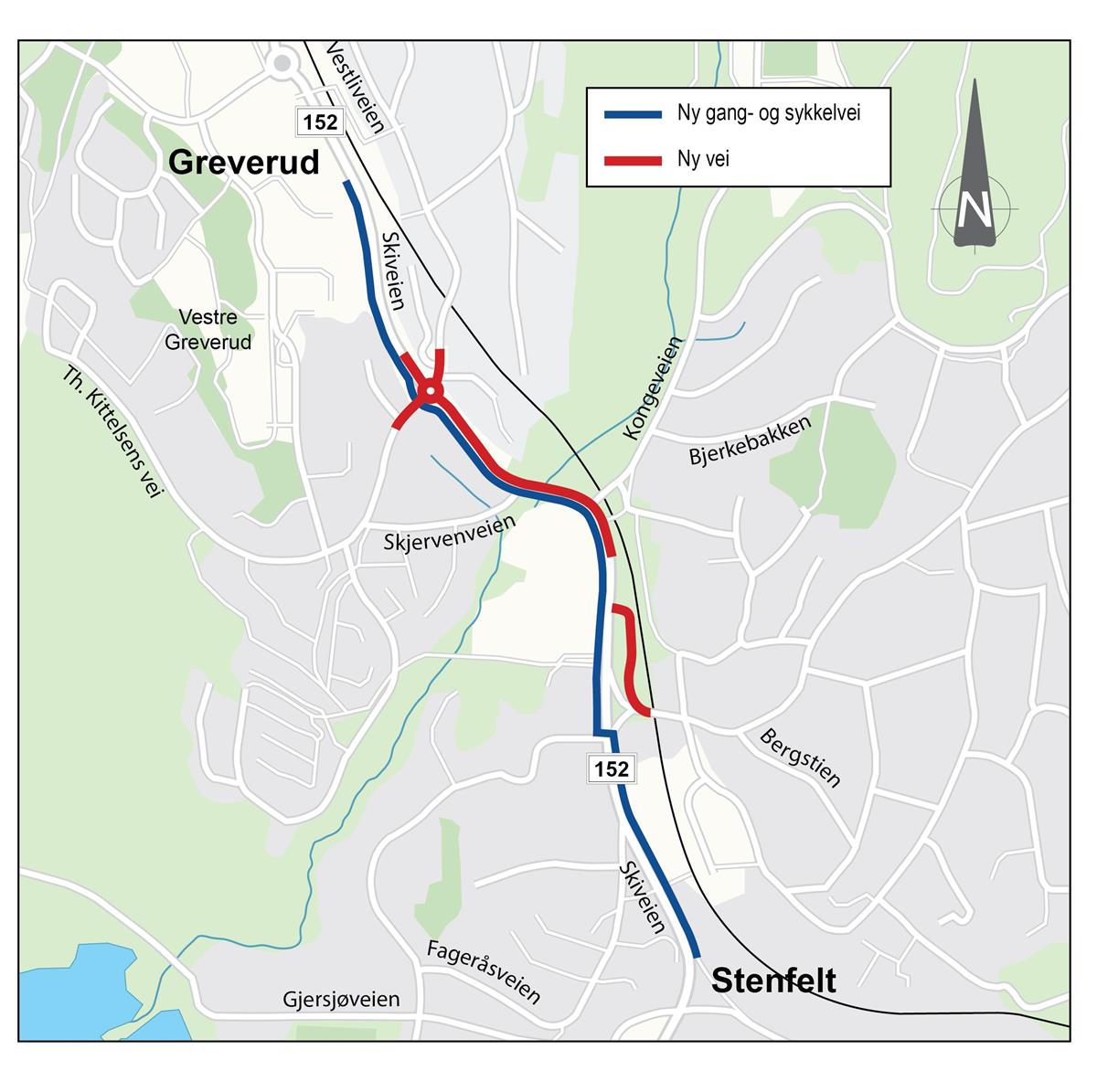 Fylkeskommunen er i gang med bygging av ny gang- og sykkelvei mellom Stenfelt og Greverud langs fylkesvei 152 Skiveien. Det skal bli et brukervennlig og trafikksikkert tilbud for myke trafikanter. Planlagt sluttfrist er vår 2026.